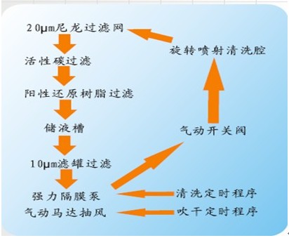 10微米尼龙过滤纸→活性碳过滤→5微米阳性还原树脂过滤→储液槽→2微米滤罐过滤→强力隔膜泵→气动马达抽风→气动开关阀→旋转喷射清洗腔→20微米尼龙过滤纸然后重复循环。 另外在强力隔膜泵时可设定清洗定时程序,在气动马达抽风时可设定吹干定时程序。