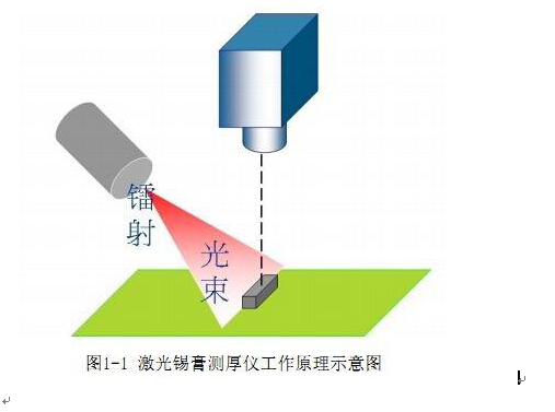 非接触式激光测厚仪是由专用激光器产生线型光束,以45°由侧面投射,较高之物件(锡膏)首先被镭射投影到,其次在投影到较低之基板平面,如此即形成两条垂直光线,因为待测目标与周围基板存在高度差,此时观测到的目标和基板上的激光束相应出现断续落差(如图1-1所示)根据三角函数关系可以通过该落差间距计算出待测目标截面与周围基板的高度差,从而实现非接触式的快速测量。